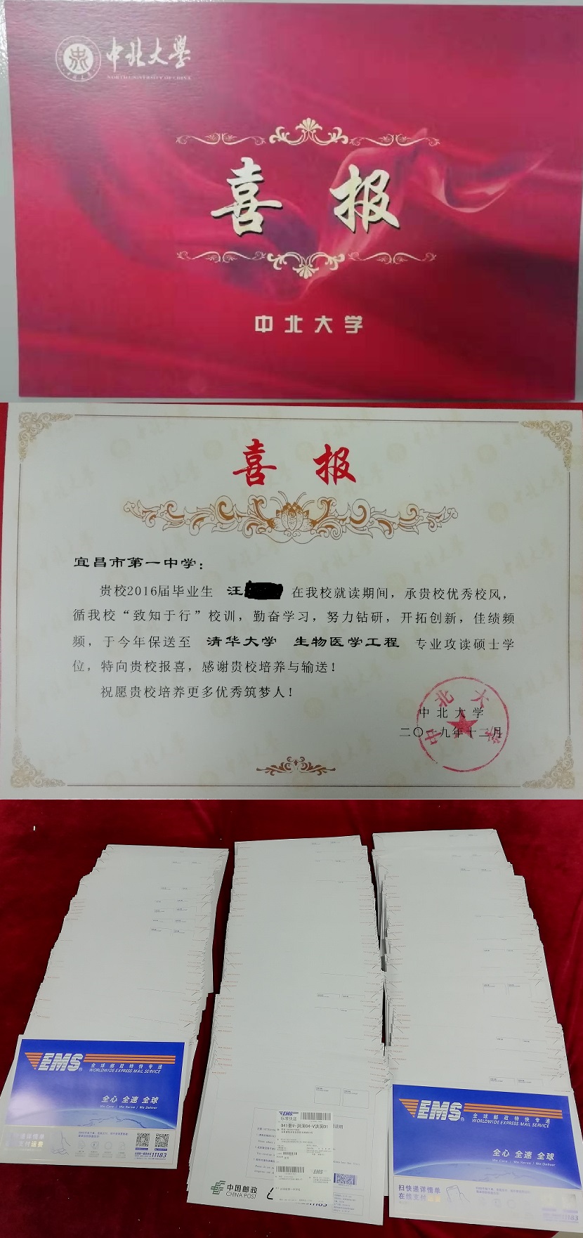 为加强与生源高中之间的沟通联系,分享优秀学子华丽转身的喜悦,发挥典型示范作用。12月24日,我校通过邮政EMS特快,向我校近300名保送至清华大学、复旦大学、中国科学院大学等知名高校及科研院所攻读硕士或直博的2020届优秀毕业生的高中母校寄送喜报,将学生的相关情况告知其母校和老师,共同分享收获的喜悦。