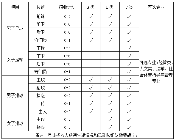 5. 为保证高水平运动员顺利完成学业,高水平运动队一般录取专业为经管类、人文类、社会体育指导与管理等专业。高考成绩(含政策加分)达到生源地本科第一批次录取控制分数线(对于合并本科批次或者高考改革的省份按省级招生考试机构划定的高水平运动队参考录取控制分数线执行)的考生,可以书面形式申请报考学校其他专业。