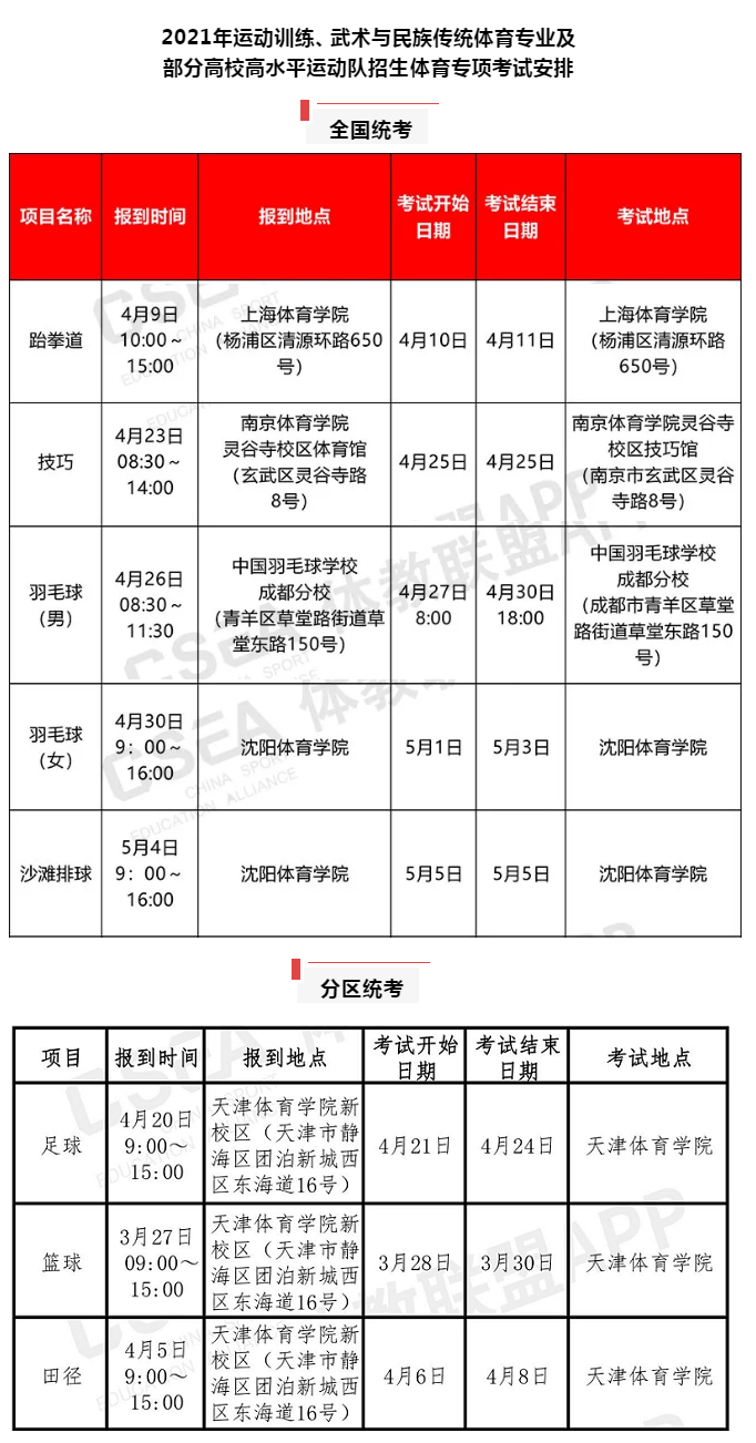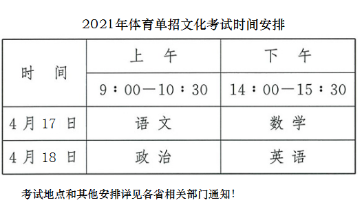 2021年体育单招及部分高水平体育专项考试全国统与考分区统考安排