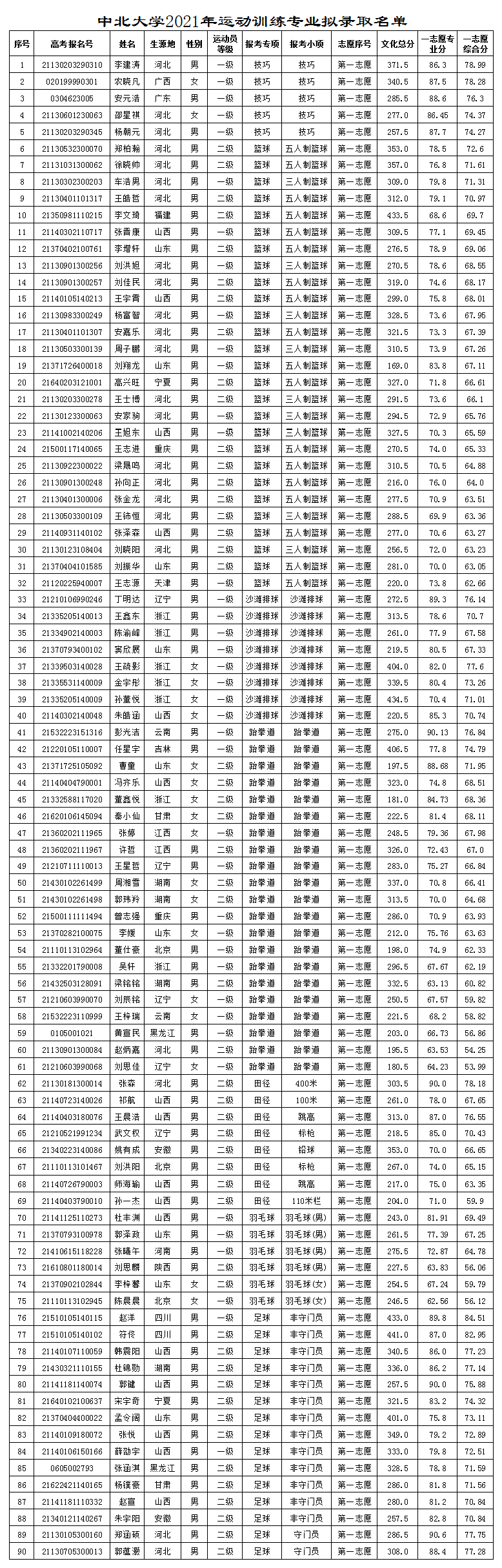 中北大学2021年运动训练专业招生计划90人。根据体育总局办公厅教育部办公厅《关于印发<2021年普通高等学校运动训练、武术与民族传统体育专业招生管理办法>的通知》文件精神和《中北大学2021年运动训练专业招生简章》规定,学校2021年运动训练专业文化成绩一级运动员最低录取控制分数线确定为150分,二级运动员最低录取控制分数线确定为180分,技巧、沙滩排球和田径项目体育专业成绩最低录取控制线为70分,其余项目专业成绩最低录取控制线为60分。