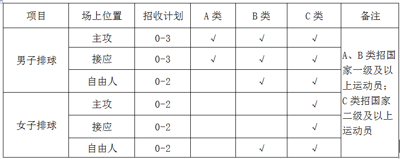4、报考我校高水平运动队排球项目考生的身高要求:男子主攻和接应身高1.86米(含)以上。
