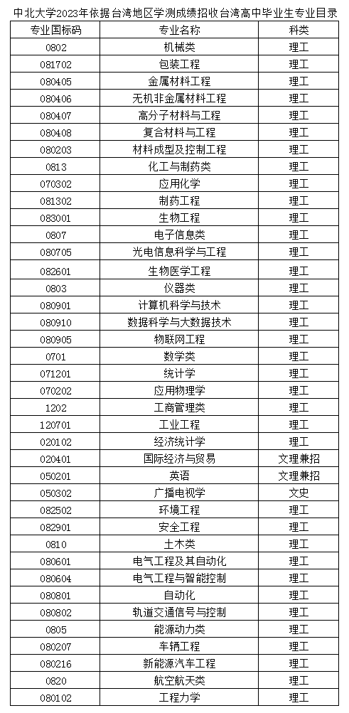 中北大学2023年依据台湾地区学测成绩招收台湾高中毕业生简章
