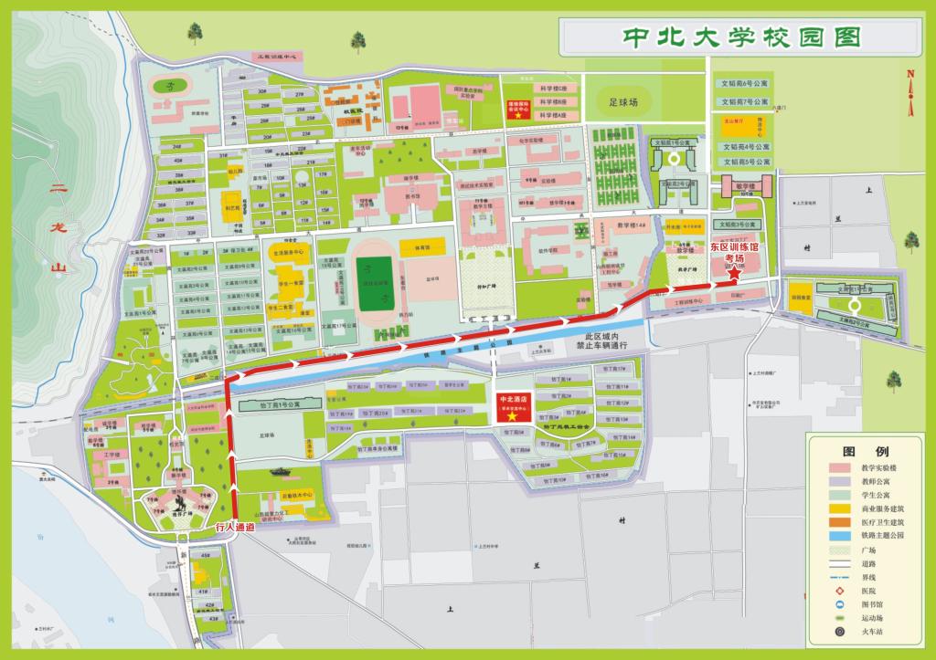 2.报到及测试当天,考生统一从中北大学行人通道(一道门东侧100米处)进出校园(路线见下图),到达考场步行大约需20分钟。
