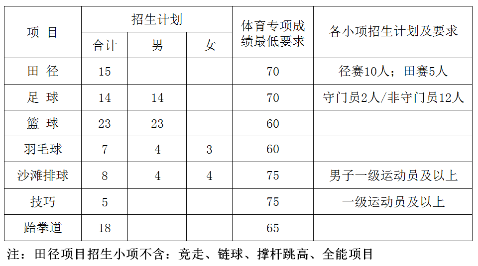 4.依据考生填报的志愿梯次顺序,根据生源情况和分项目进行录取,录取控制线上的考生按照综合分由高到低,优先录取一志愿考生。录取过程中,如各小项未完成招生计划时,将剩余计划移至本项目内其他小项,羽毛球和沙滩排球项目未按性别完成计划时,在项目内调整,各项目未完成招生计划时,招生计划将移至其他项目,顺序依次为篮球、羽毛球、跆拳道。若第一志愿仍未完成计划的情况下录取二志愿考生,所有项目考生按综合分从高到低依次录取,若考生综合分低于本专项一志愿录取最低录取分将不予录取。