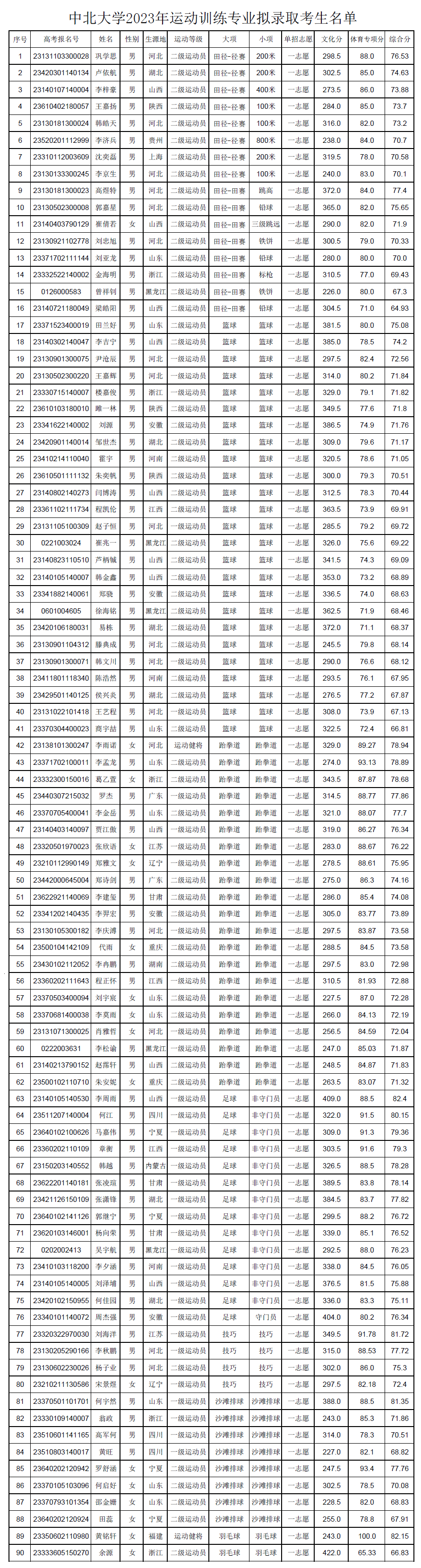 中北大学2023年运动训练专业拟录取考生名单公示